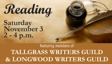 The next session of Longwood Writers Guild is Mon., Oct. 15, 7 p.m., BAPA Community Room, 11109 S. Longwood Dr. Please bring something you are working on to share for critique, or write a piece from the prompt: I (he, she) wiped my hands on the cloth then put it into the trash container, making sure…